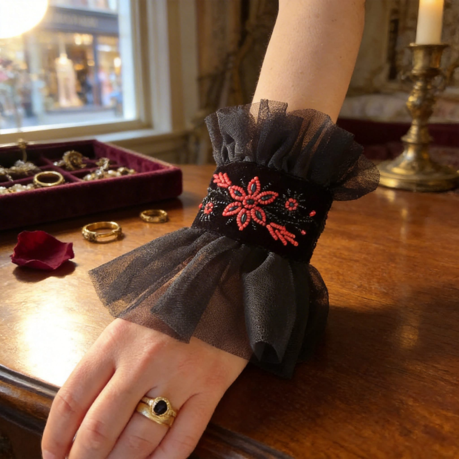Realizată integral manual, manșeta îmbină textura luxoasă a catifelei cu delicatețea transparentă a tulle-ului, creând un contrast vizual elegant și sofisticat. Fiecare piesă este ornată cu mărgeluțe cusute cu grijă, care prind lumina și adaugă un plus de strălucire oricărei ținute.