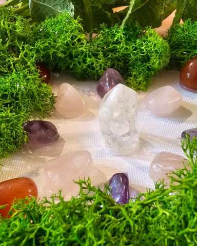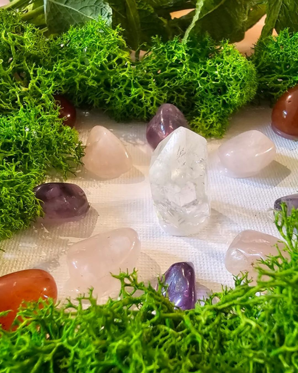 În centru: un vârf de cuart transparent, ca un far interior. Îl înconjoară ametistul care aduce claritate, cuartul roz care te aduce înapoi în inimă, și carneolul care îți reamintește că visurile tale merită efort.