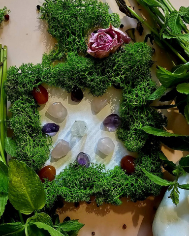 Această decorațiune de cristale este o compoziție ritualică și artistică creată pentru a susține claritatea mentală, consecvența în acțiune și ancorarea în prezent. Este realizată pe un canvas pătrat, simbol al stabilității, cu margini de mușchi stabilizat – care amplifică conexiunea cu natura și energia statică de protecție.